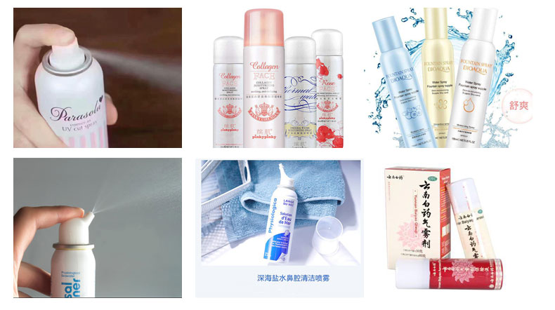 該生產(chǎn)線廣泛適用于化妝品、藥品等車間,例如防曬噴霧、保濕噴霧、生理鹽水鼻腔噴霧、爽膚水等二元噴霧產(chǎn)品的灌裝。